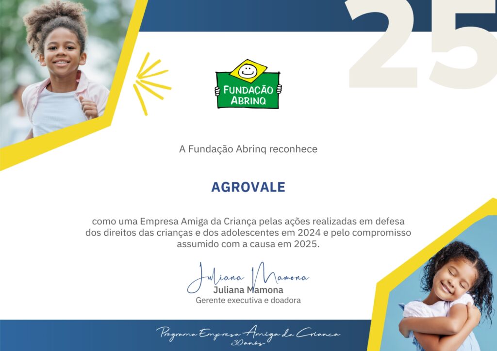 A Agrovale teve mais uma vez reconhecido seu compromisso com a infância e a adolescência. A empresa recebeu da Fundação Abrinq a renovação do Selo Empresa Amiga da Criança, destacando as ações realizadas em 2024 e o compromisso assumido com a causa para 2025.