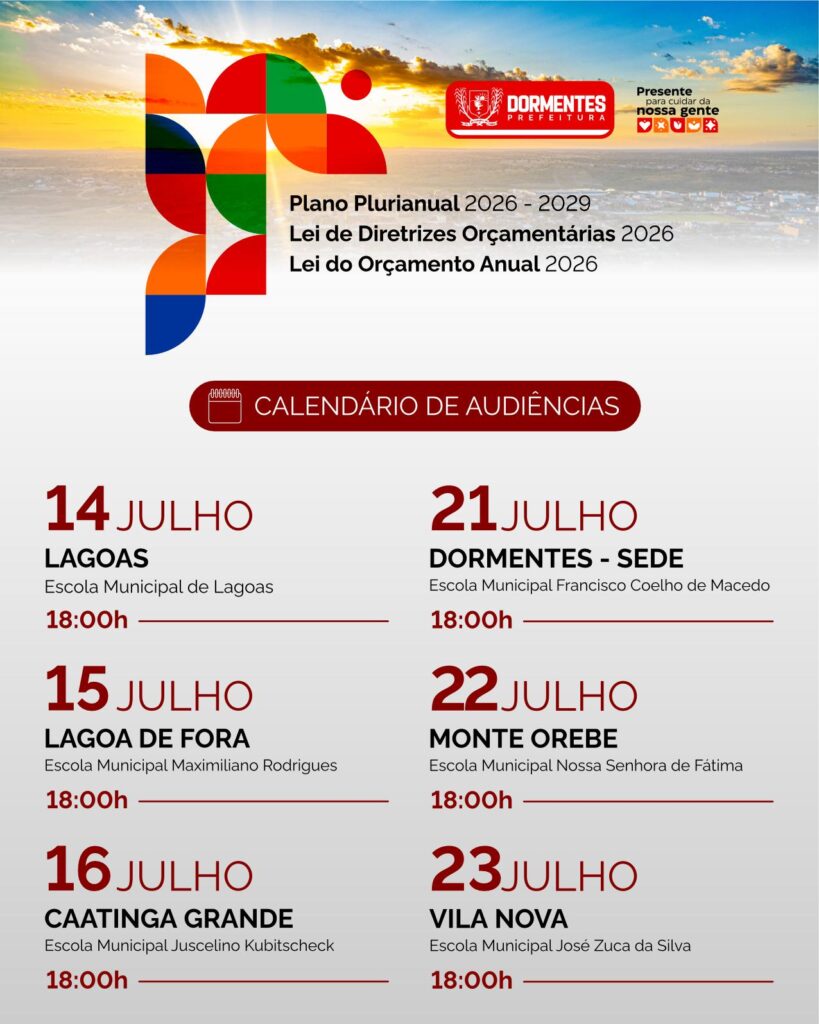 As audiências públicas vão ser realizadas em todos os distritos e na sede do município, e são abertas a todos: moradores, lideranças comunitárias, representantes de associações, sindicatos, setores produtivos, juventude, entre outros. Além da participação presencial, os dormentenses também podem contribuir de forma online, enviando sugestões através do formulário digital: https://forms.gle/8xoZnAV1LsDexT818