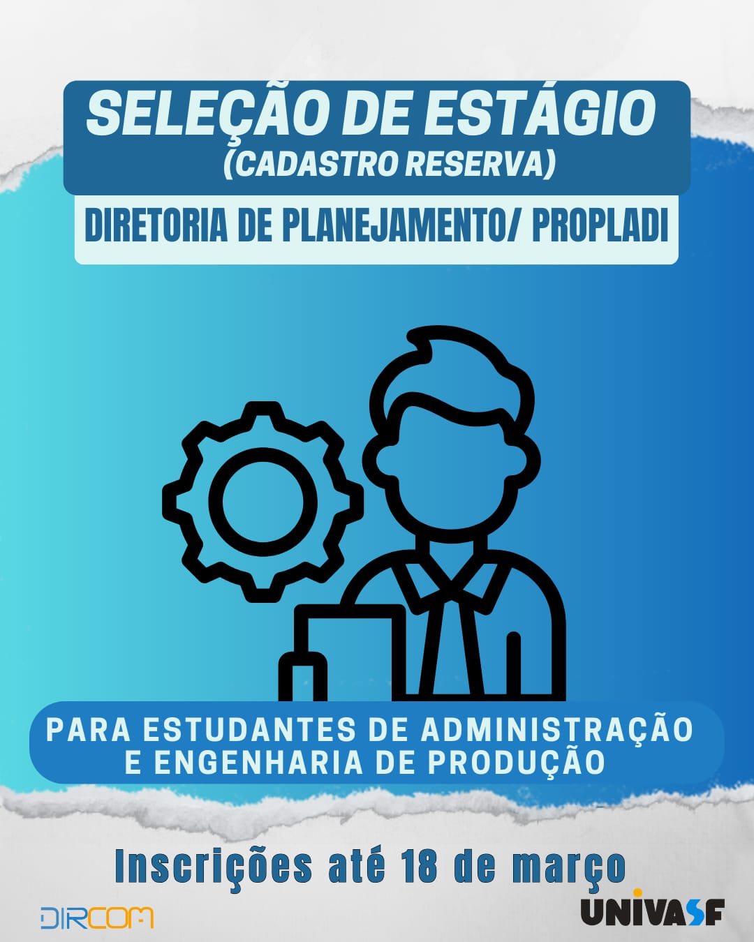 A Pró-Reitoria de Planejamento e Desenvolvimento Institucional (Propladi) da Universidade Federal do Vale do São Francisco (Univasf) está com inscrições abertas para processo seletivo de estágio na área administrativa, destinado à formação de cadastro de reserva. Podem participar estudantes de graduação em Administração ou Engenharia de Produção que tenham cumprido, no mínimo, 30% da carga horária do curso. As inscrições seguem abertas até o dia 18 de março.