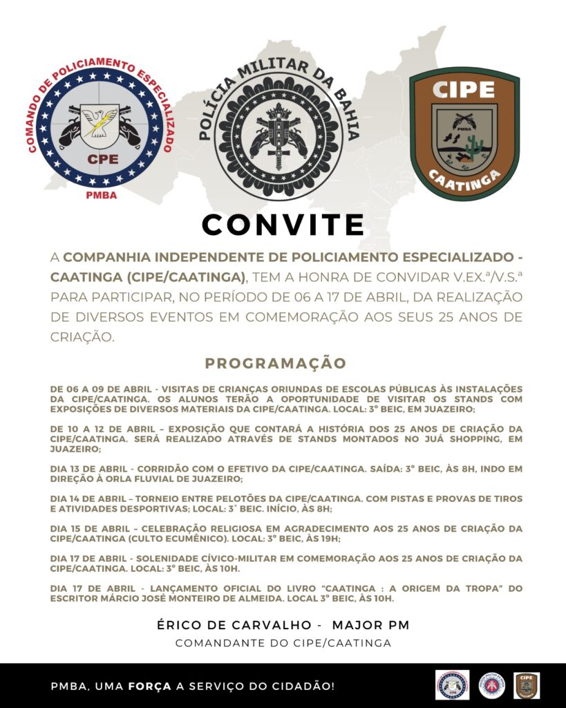 A PMBA, através da Companhia Independente de Policiamento Especializado – Caatinga (CIPE/Caatinga), realizará no período de 06 a 17 de abril, diversos eventos em comemoração aos 25 Anos de Criação dessa Unidade especializada no bioma caatinga.