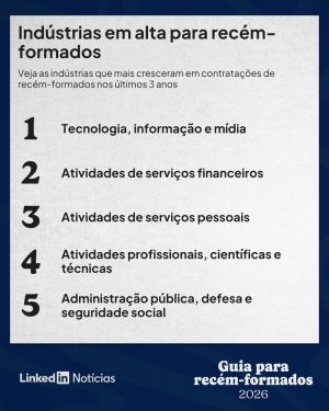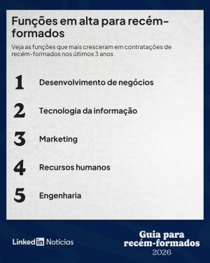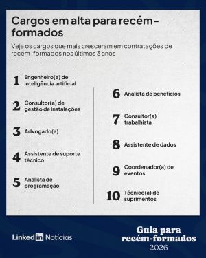 São Paulo, 15 de abril de 2026 – O LinkedIn, maior rede social profissional do mundo, divulga hoje o Guia para Recém-Formados 2026, com um mapeamento dos cargos, funções e setores que mais cresceram na contratação de profissionais em início de carreira no Brasil. O estudo aponta as principais portas de entrada para quem concluiu recentemente a formação.